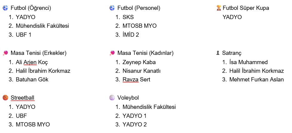 Rektörlük Güz Kupası Turnuvalarına katılım sağlayan tüm sporcularımızı, takımlarımızı ve organizasyonda emeği geçen herkesi tebrik eder; sporla iç içe, keyifli ve sağlıklı bir üniversite yaşamına katkı sunan bu tür etkinliklerin artarak devam etmesini dileriz.