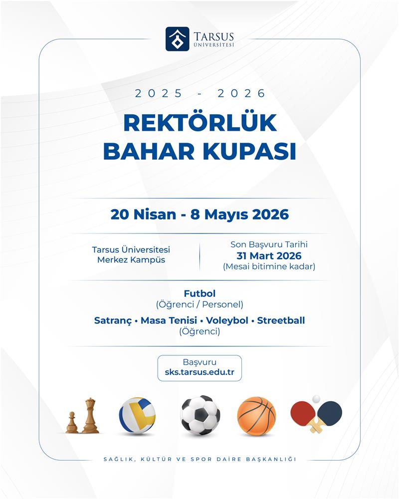 Üniversitemiz fakülte, yüksekokul ve meslek yüksekokullarının katılımıyla 20 Nisan - 8 Mayıs 2026 tarihleri arasında öğrencilerimiz için futbol, streetball, voleybol, masa tenisi ve satranç branşlarında; idari ve akademik personel için ise futbol branşında eleme usulüne göre 2025-2026 Eğitim-Öğretim Yılı Rektörlük Bahar Kupası Spor Müsabakaları düzenlenecek olup müsabaka talimatları ile gerekli formlar yazımız ekinde yer almaktadır.