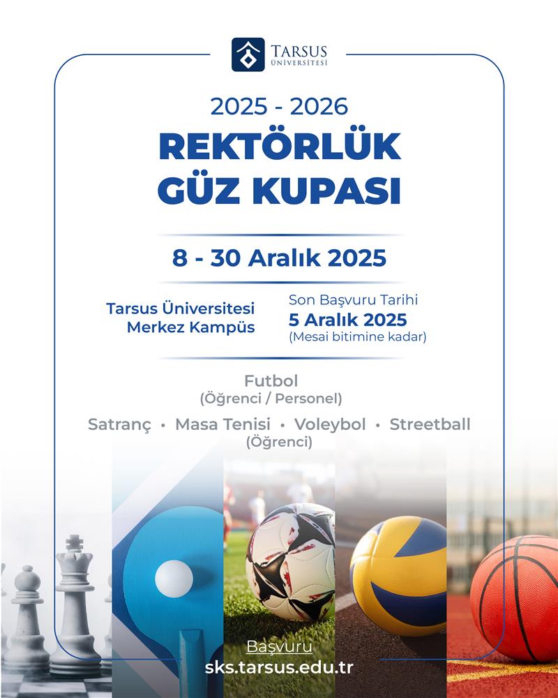 08-30 Aralık 2025 tarihleri arasında öğrencilerimiz için futbol, streetball, voleybol, masa tenisi ve satranç branşlarında; idari ve akademik personel için ise futbol branşında eleme usulüne göre 2025-2026 Eğitim-Öğretim Yılı Rektörlük Güz Kupası Spor Müsabakaları düzenlenecek olup müsabaka talimatları ile gerekli formlar yazımız ekinde yer almaktadır.