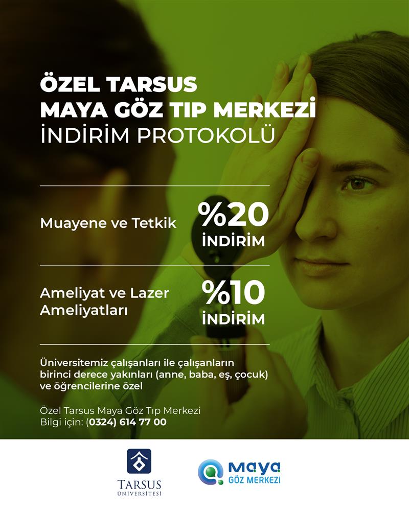 Üniversitemiz ile Özel Tarsus Maya Göz Tıp Merkezi arasında personelimizi ve öğrencilerimizi kapsayan indirim protokolü 27.08.2025 tarihinde imzalanarak yürürlüğe girmiştir.
