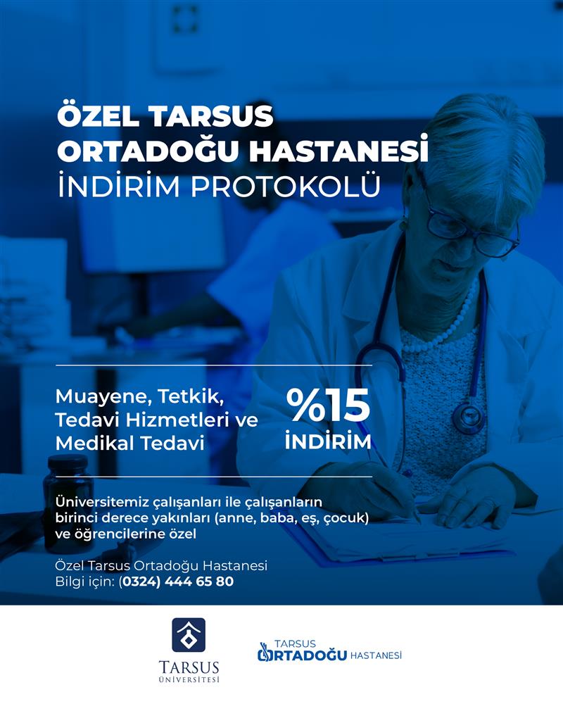 Üniversitemiz ile Özel Tarsus Ortadoğu Hastanesi (Tarsus Yeni Umut Tıp Özel Sağlık Hizmetleri A.Ş.) arasında personelimizi ve öğrencilerimizi kapsayan indirim protokolü 28.08.2025 tarihinde imzalanarak yürürlüğe girmiştir.