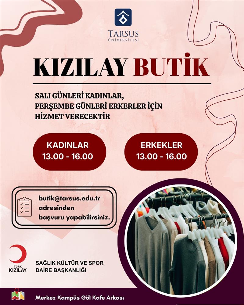Butikten faydalanmak isteyenler Sosyal İnceleme ve İhtiyaç Tespit Formunu doldurup gerekli belgelerle birlikte butik@tarsus.edu.tr adresine mail atarak başvurabilirler.
